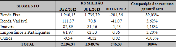 O quadro abaixo, que mostra como estão distribuídos os recursos garantidores do plano entre os vários segmentos de investimentos, bem como as características de rentabilidade do investimento em renda fixa (títulos do governo), explicam a razão da queda do valor da cota verificada este ano.
